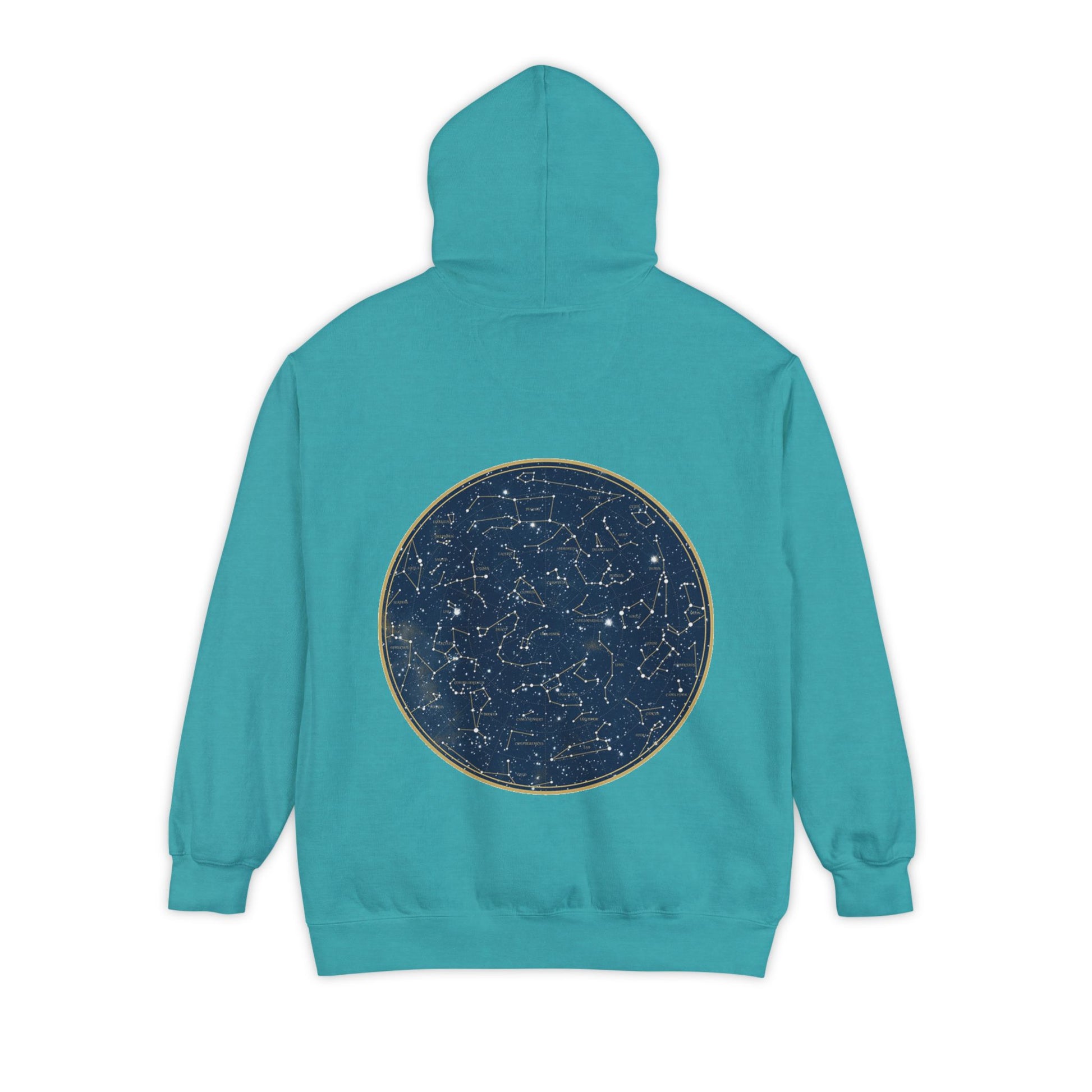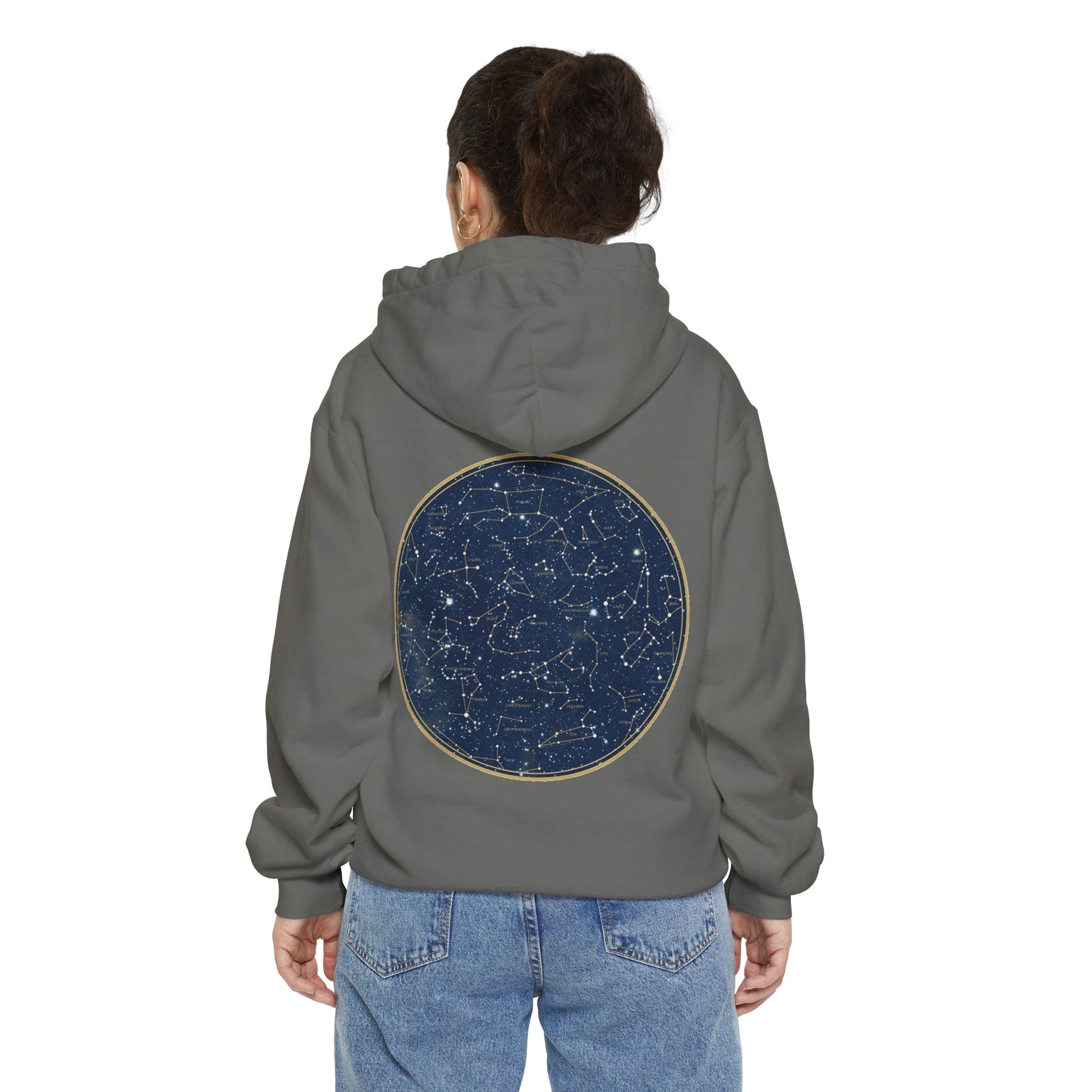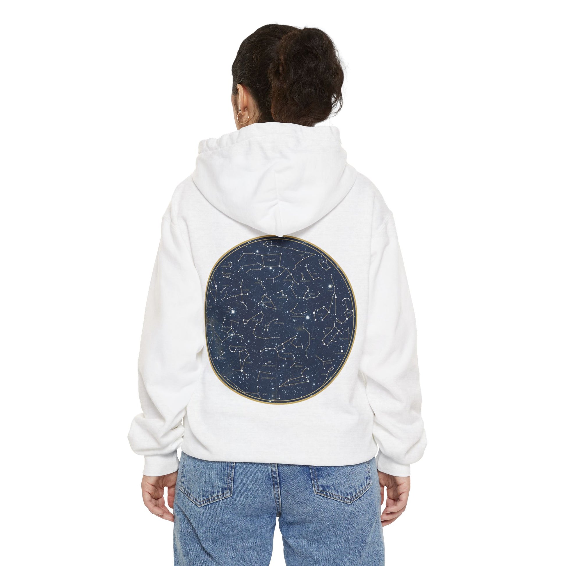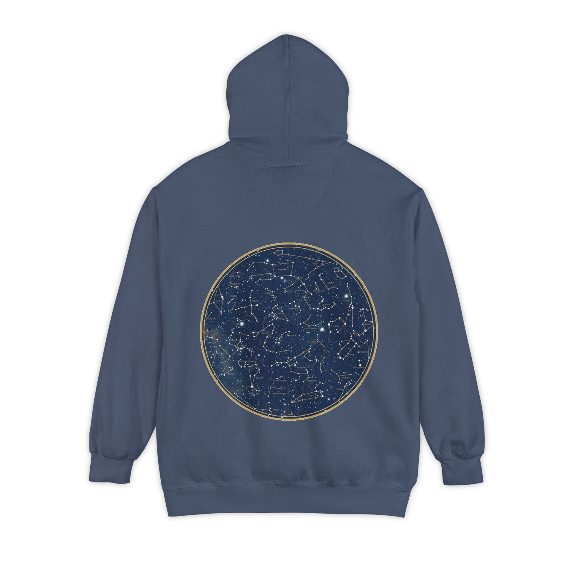 A soft, garment-dyed hoodie embroidered with a quiet, personal touch on the chest and a detailed star-map print on the back. The heavy, ringspun cotton blend drapes with a relaxed silhouette that invites you to pull the hood up on cool evenings. The subtle front script reads like a private note, while the circular constellations on the back feel like an old atlas — comforting, curious, and made to be lived in. Wear it on slow nights watching the sky, on late drives, or layered over a tee for walks through town. The substantial fabric and thoughtful details (twill neck tape, ribbed cuffs, and a half-moon back patch) keep it feeling durable and familiar wash after wash.