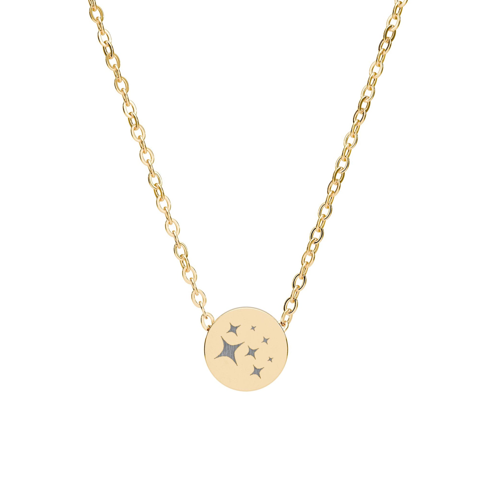 A delicate, engraved mini circle necklace that whispers quiet elegance. The small round pendant carries a subtle star-cluster engraving, catching light with each turn and resting close to the collarbone. Lightweight and low-profile, it layers beautifully with other pieces or stands alone for an understated, personal statement. Crafted from surgical-grade 316L stainless steel with optional PVD finishes, it resists tarnish and keeps its gentle shine through daily wear. Designed for adults who favor minimalist jewelry with meaning—this necklace suits moments of reflection, soft evening gatherings, and everyday wear when you want a touch of celestial calm.